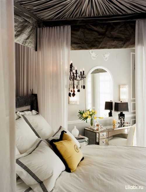 Фото спальни с балдахином и желтыми акцентами. Такой интерьер спальни придется по душе многим современным девушкам.
