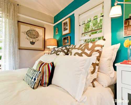Фото интерьера спальни с бирюзовой стеной и пёстрыми подушками. Яркий молодежный вариант отлично подойдет для спальни подростка.
