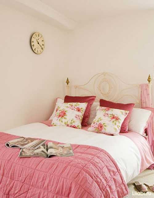 Фото спальни в романтическом деревенском стиле, выполненной в розовой цветовой гамме. Стены — молочно-белые. Белое железное изголовье прекрасно вписалось в интерер.