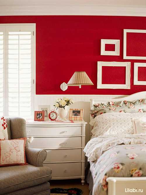 Фото спальни в стиле кантри. Традиционные ткани в клетку и цветочек, яркие алые стены и чудесный комод с ящиками.