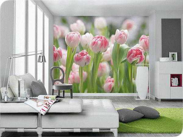 В некоторых случаях идеальным вариантом для скрытия недостатков на стенах могут стать фотообои с крупными рисунками.