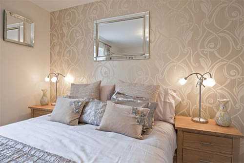Песочно-зеленые обои с рисунком и без него в интерьере спальни