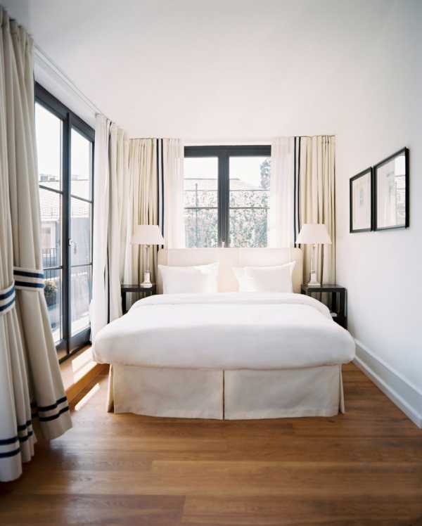 Избегайте темных плотных гардин, делайте выбор в пользу светлых прозрачных занавесок. Для большего комфорта можно постелить небольшой ковер перед кроватью.