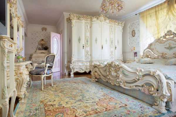 Стандартный набор дополнительной мебели: тумбочки, пуфик (мини-диванчик), трюмо, вместительный комод и вместительный шкаф.