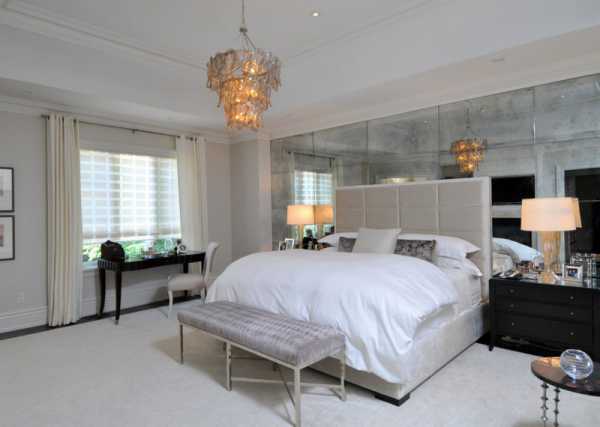 Платяной шкаф с зеркальными дверцами (шкаф-купе) лучше поставить в темный угол. Идеально заказать шкаф по длине стены. Когда шкаф-купе займет пространство от одной стены до другой, он станет красивой панелью, не будет выделяться. Удобны раздвижные дверцы.