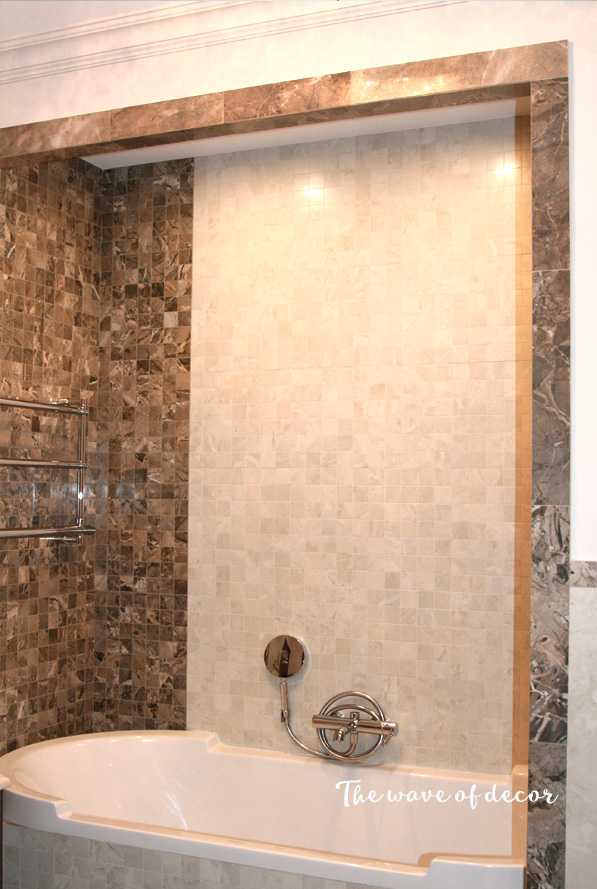 Отлично работает первый принцип совмещения материалов, когда ванна устроена в нише (мы говорили об устройстве ниш ТУТ).