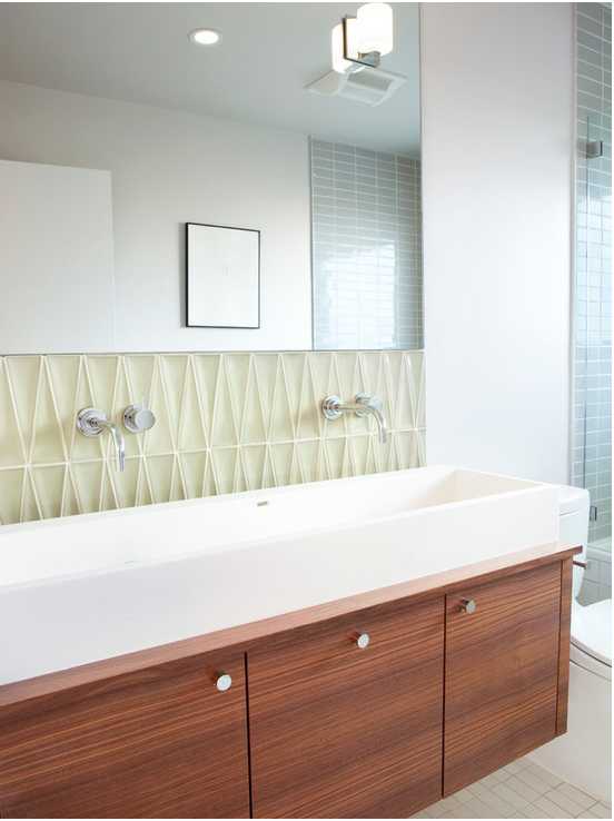 Studio OINKВторой отметкой удачной высоты может стать верхняя граница плитки в зоне раковины. Как правило кафель поднимают над столешницей на 10-30 см. (может быть и существенно выше). Расчет идет в зависимости от мебели, столешницы (с бортиком или без), от положения зеркала. Помни: все абсолютно детали участвуют в процессе определения такого узла, как высота плитки на стене в ванной.