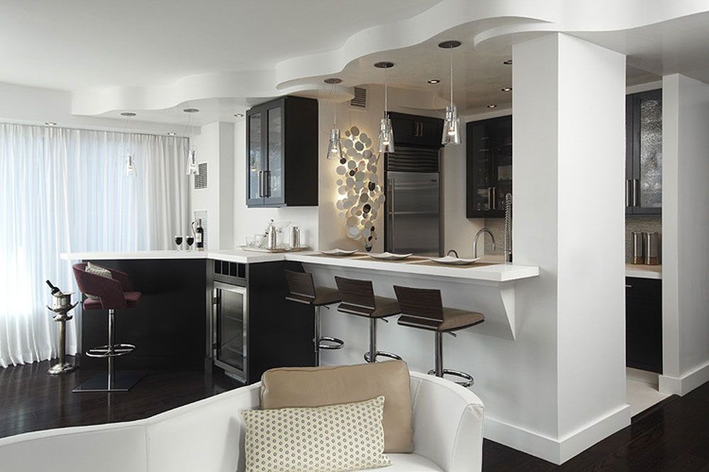 Популярным вариантом зонирования является барная стойка, которая может играть роль обеденного стола, если вы сторонник динамичного образа жизни, а ваши домочадцы не любят шумные семейные посиделки на кухне.