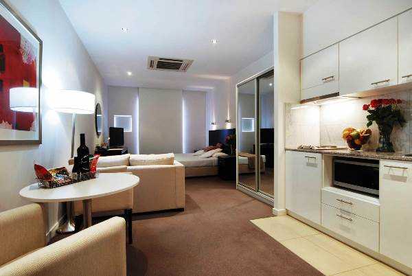 Наиболее характерной чертой однокомнатной квартиры-студии является комната, совмещенная с кухней. Не стоит переживать, что при приготовлении пищи запах будет пропитывать мебель и все ваши вещи.