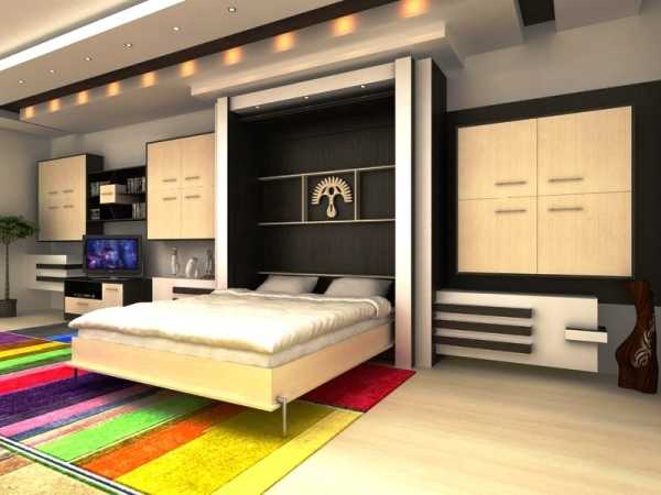 Также если у вас есть желание разместить еще и кресла или же поставить небольшой столик в комнате, стоит подумать о таком варианте, как шкаф-кровать. В сложенном положении она будет выглядеть как часть стены.