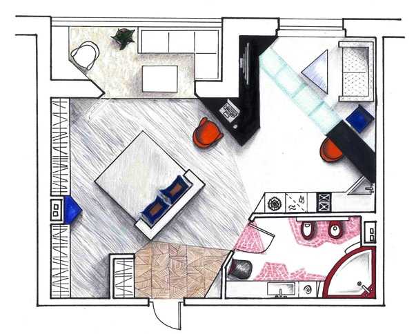 Помните! Схематичный план с габаритами позволит просчитать и грамотно разместить корпусную и мягкую мебель, с пользой используя каждый квадратный сантиметр площади. Планирование помогает избежать большинства недочетов в процессе создания дизайна однокомнатной квартиры-студии с небольшой квадратурой.