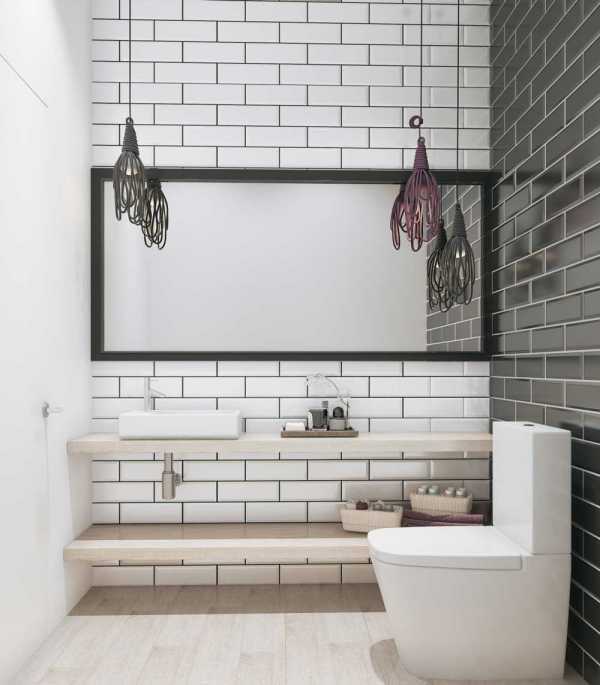В основе интерьера использована прямоугольная форма плитки. Она украшает стены санузла, и выложена несколькими способами: