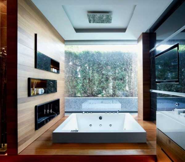 Наличие достаточного количества свободного места, позволяет создать необычный дизайн, превращая обычную ванную в настоящую зону релакса.