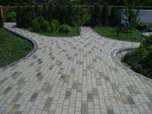 Если Кирпичи ориентированы поперек тропинки, вначале укладывается весь ряд малого радиуса со смещением продольных швов в виде клина, размер которого подбирается опытным путем по месту.