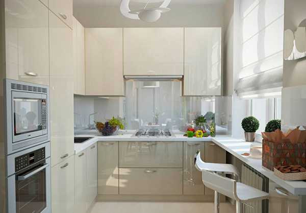 Во-вторых, выбирайте светлые оттенки и зеркальные поверхности. Желательно, чтобы цвет гарнитура не сильно отличался от отделки.