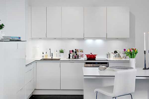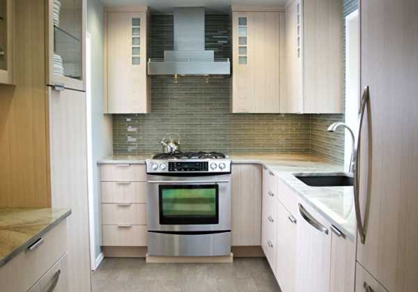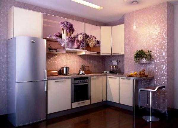 Кроме оптимизированной планировки, маленькая кухня нуждается еще и в правильном дизайне. Основная проблема всем известна — это мало места. Идеальный стиль для маленькой кухни — это минимализм. Это поможет избежать беспорядка в ней. Кроме этого, в этом стиле можно применить различные приемы, позволяющие визуально увеличить пространство кухни. Это могут быть, как традиционные приемы со светлыми стенами и зеркалом. А могут быть и специальные с применением продуманной подсветки потолка по периметру. Подсветки стеклянного кухонного фартука с панорамной фото печатью и др.