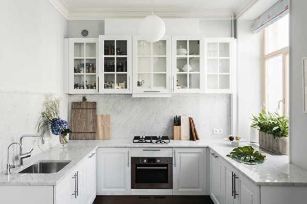 Г-образную планировку можно выбрать, если требуется оставить свободный угол для обеденной зоны. В таком случае мойка устанавливается в углу, а остальное — по разные стороны от нее.