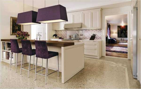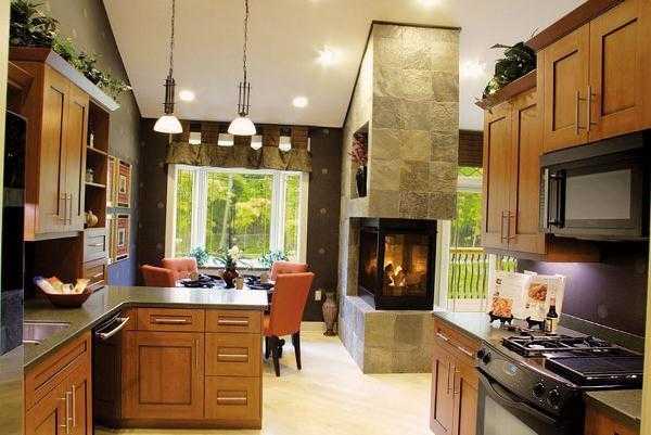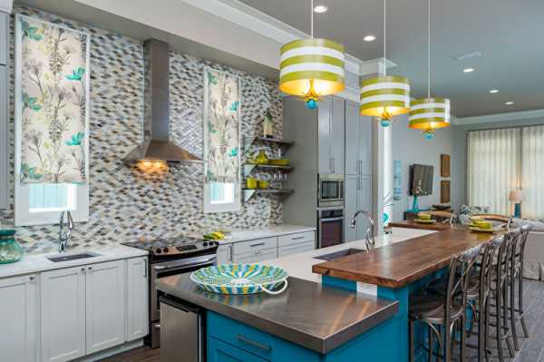 Каждая функциональная зона на кухне должна быть полноценно освещена: рабочая поверхность, плита, мойка, барная стойка или остров, над которым можно установить подвесные светильники.