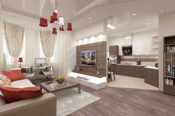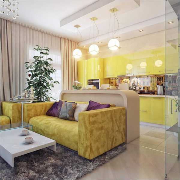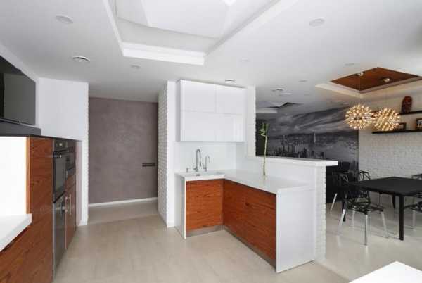 По аналогии с большой кухней, в квартирах студиях, где все находится в одном месте, отделить зону гостиной от кухни можно самыми разными способами. От традиционных барных стоек и диванов, заканчивая всевозможными перегородками, стеллажами и даже обоями, если их поклеить разные в двух зонах. В некоторых случаях одну зону от другой можно отделить, если например, в зоне кухни соорудить подиум. Довольно эффектно решение, особенно если в подиум встроить подсветку. Правда такой прием подойдет для достаточно просторных комнаты от 20 кв.м, ведь всю такую «островную» красоту можно оценить находясь либо в ней или вдали от нее.