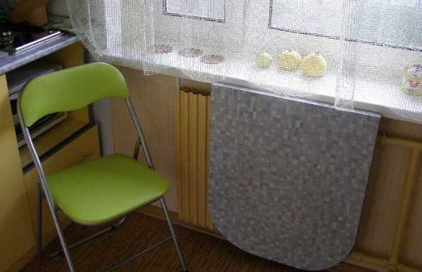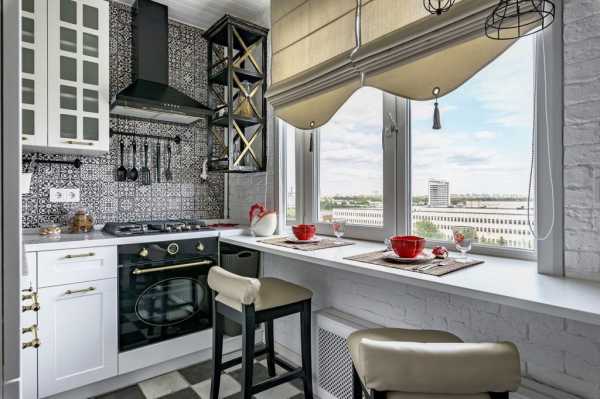 Также стоит в такой кухне отказаться от традиционных штор, лучше их заменить на жалюзи или рулонные шторы. Это поможет «отвоевать» подоконник, который вполне может послужить обеденным столом, если его слегка выдвинуть из проема окна или прикрепить к нему раскладной стол, как на фото