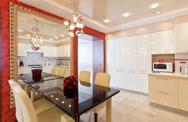 Потолок даже больше подвержен осадкам от горячих паров, чем стены, поэтому эта часть кухни также должна быть практичной. А это значит, что традиционна побелка здесь совсем не подойдет. Потолок нужно либо покрасить глянцевой краской или соорудит натяжные или подвесные потолки. При этом предпочтение лучше отделать, если не глянцевым, то хотя бы гладким отделочным материалам. По возможности следует исключить многоуровневые потолки. Ведь в уборке они будут сложнее, особенно те, что имеют «карманы» для светодиодной подсветки.