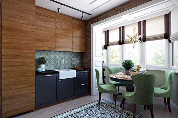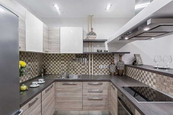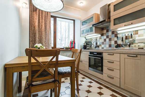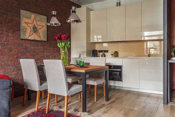 Отличное решение — комбинация покрытия в разных зонах. К примеру, в рабочей области можно положить керамическую плитку, которая устойчива к внешнему влиянию, а в обеденной — паркет или ламинат.