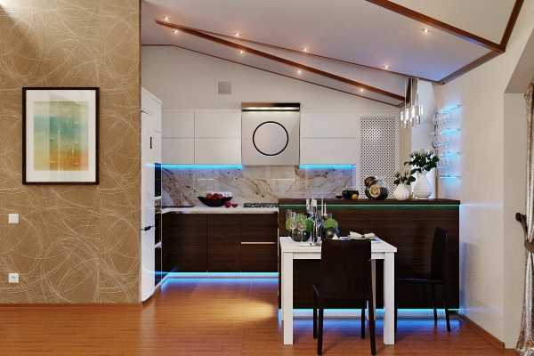 Освещение играет огромную роль в зонировании любого помещения, поэтому достаточно важно сохранить световой баланс и создать плавный переход от одной комнаты к другой. Для кухни лучше выбрать мощную и яркую люстру, которая станет основным источником света. А в качестве дополнительного освещения, когда не требуется яркий свет, установить точечные светильники в районе барной стойки, над мойкой и рабочей поверхностью. В последнее время все большую популярность набирает установка светодиодной ленты, которая прекрасно справляется с зонированием кухни и зала. Для гостиной лучше выбрать несколько неярких источников, например, бра или торшеры. Их приглушенный свет придаст уют комнате и настроит на отдых.