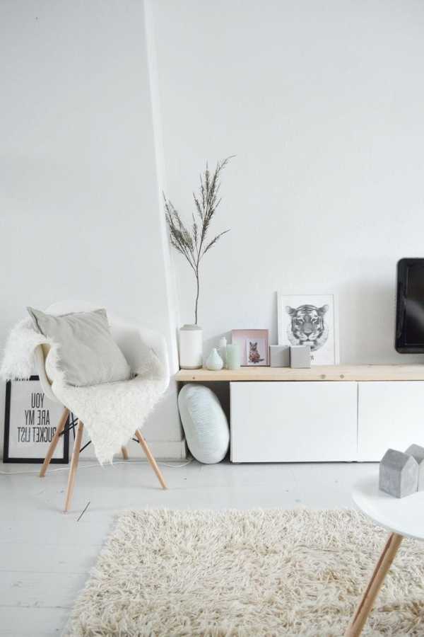 Многие дизайнеры предлагают сочетание белоснежного тона и деревянных поверхностей, природный рисунок которых привнесет в интерьер теплоту. Оно считается самым гармоничным и фактурным при оформлении гостиной.