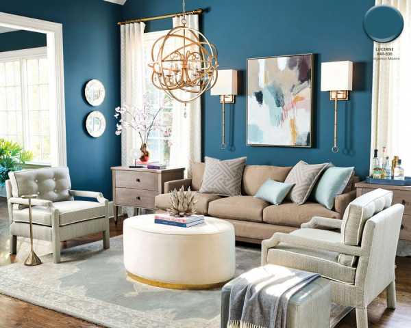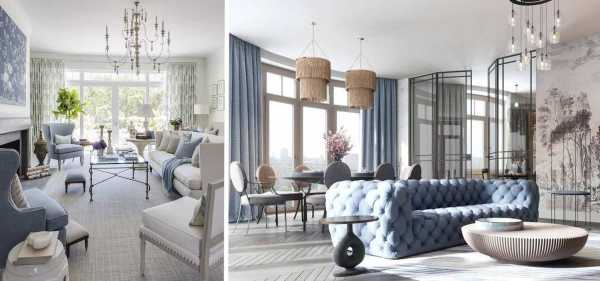 В интерьере гостиной 2019 года приветствуется игра с оттенками холодных тонов
