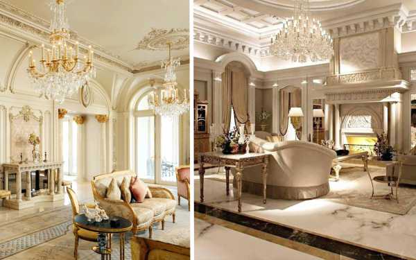 Потолок чаще белого цвета с характерным наличием лепнины, стены украшены античными фресками и старинными картинами.