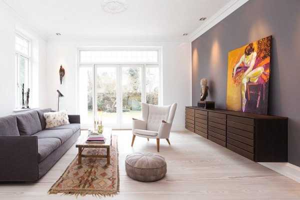 Решая, как красиво оформить гостиную, обратите внимание на популярные в этом году оттенки. Белый цвет по-прежнему в тренде. Особенно хорошо выглядит он в малогабаритных помещениях. Несколько оживит воздушное белоснежное пространство яркий, крупный акцент – к примеру, кресло или диван. Очень эффектно на белом фоне смотрится и темная мебель.