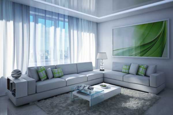 В тренде гладкие белоснежные полотна, если потолок натяжной, то можно использовать глянец. Подвесные конструкции дают возможность зонировать комнату, подбирая нужное освещение.