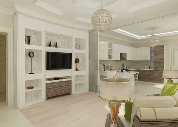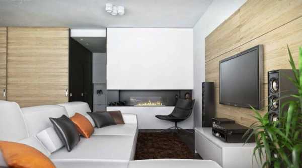 Необычные светильники по бокам от телевизора, придают элегантность . А темный серо коричневый фон за ним законченность композиции. Белый ламинат уложен единым контуром с кухней. Так же можно использовать инженерную доску или другое напольное покрытие. Старайтесь избегать порожков между покрытиями.