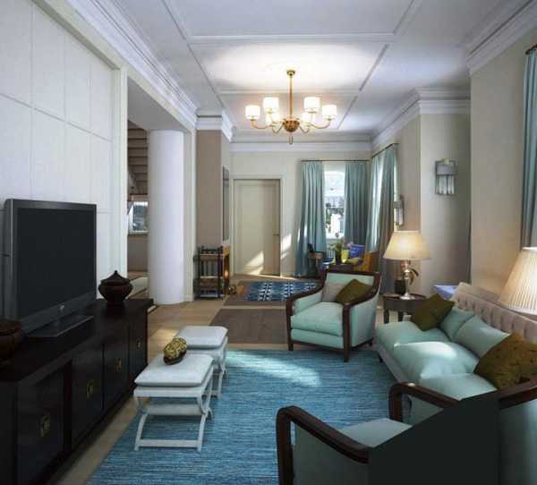 Бирюзовый цвет великолепен, он подчеркивает статус и богатство мебели. Придает уют и заботу. темный пол и светлые стены, украшенные окантовкой. На потолке представлена фрезка ручной работы. Она придает законченный вид.