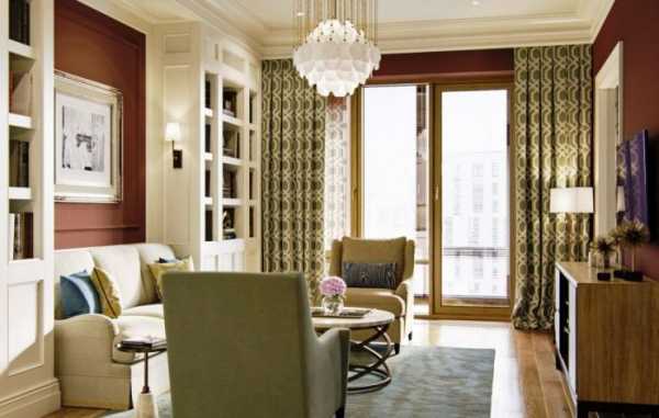 При выборе классического дизайна интерьер комнаты, совмещенной с лоджией, придется продумать вариант оформления проема между двумя помещениями.