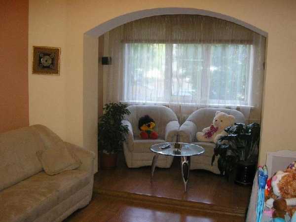 Если из-за особенностей строительства дома, невозможно полностью убрать перегородку между залом и лоджией, профессиональные дизайнеры рекомендуют обыграть ее, сделав проем в виде арочной конструкции. При правильном совмещении можно сделать гостиную продолжением балкона, рационально использовать его пространство.