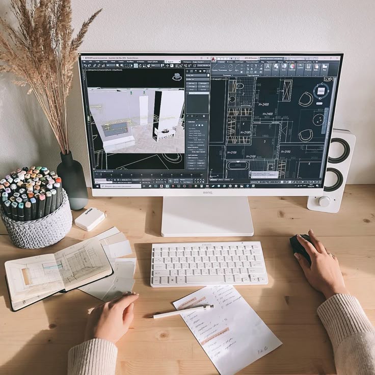 Die Skizze zeigt einen Tisch, eine Lampe, Wände, ein Fenster und einen Lagerbereich. Farbmuster werden neben der Skizze aufgefächert. Ein lila Stift und ein Lineal sind im Hintergrund.