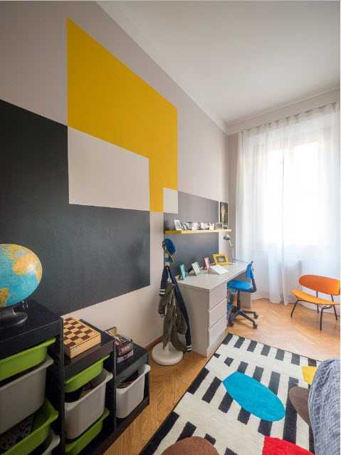 Пожалуй, один из самых простых методов создания необычного настенного узора – это нанесение ярких полосок красками контрастных оттенков. Сделать это можно с помощью валика (если полосы будут широкими) или кисти (если они будут узенькими), малярного скотча и качественного цветного покрытия.