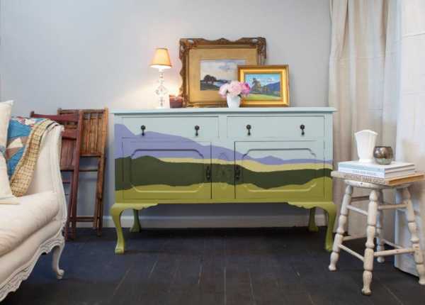 Плавные линии могут украсить и другие предметы — кухонные шкафы, столы в гостиной, тумбочки в спальне, изголовье кровати. Иллюстрация на комоде с фотографии напоминает ландшафт. Расписные узоры можно рисовать в самых разных вариациях: разноцветные абстракции, волнистые линии с точно очерченными границами, диагонали с нечеткими краями и т.д.
