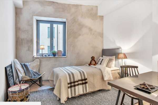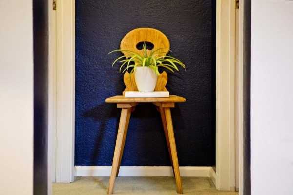 Стену вовсе не обязательно красить целиком и полностью. Можно так, как на фотографии, заранее определить рамки и с помощью малярного скотча ограничить область покраски. А можно и совсем без него, оставив края неровными. Такой прием подойдет как для всех стен, так и для одной, которая и станет акцентной. Если хочется намеренной небрежности в деталях, покрасьте всю поверхность ровно, кроме края у самого потолка.