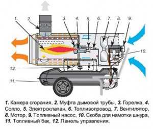С одной стороны монтируется вентилятор нагнетающий воздух. Внутри трубы устанавливается камера сгорания. Топливо подается в камеру сгорания насосом и распыляется форсункой.
