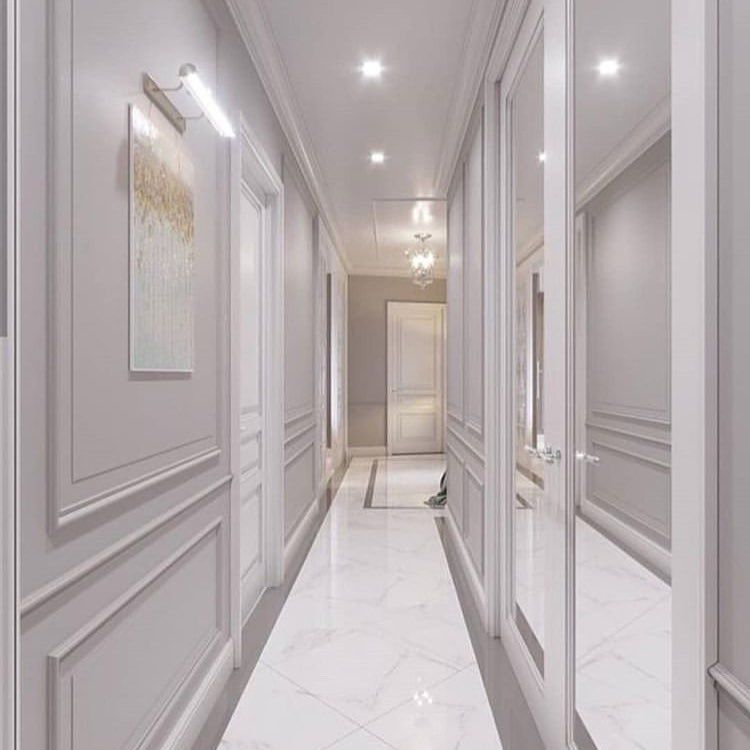 Длинный коридор в роскошной квартире с белыми потолочными светильниками