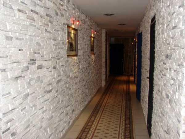 Для отделки стен длинного прохода выбор оставляют материалам, хорошо поддающимся влажной уборке. Можно использовать моющиеся обои, декоративную штукатурку, отделочный камень и другие материалы. Наиболее распространенный вариант — использование моющихся обоев.