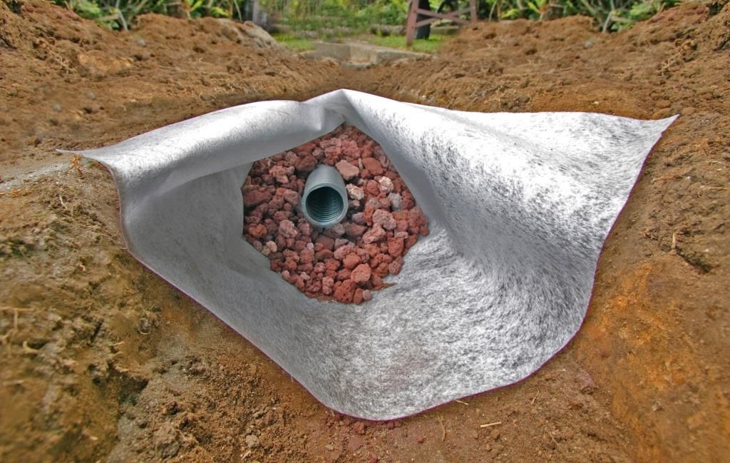 Высоким стандартом можно назвать наличие цепочки труб дренажа, размещенных в подсыпке внутри траншеи. Однако ввиду того что дренажный слой может со временем заиливаться, его нужно отделить от основного шара грунта. Как раз для этих целей используется геоткань. Она пропускает влагу, но не дает дренажу забиваться.