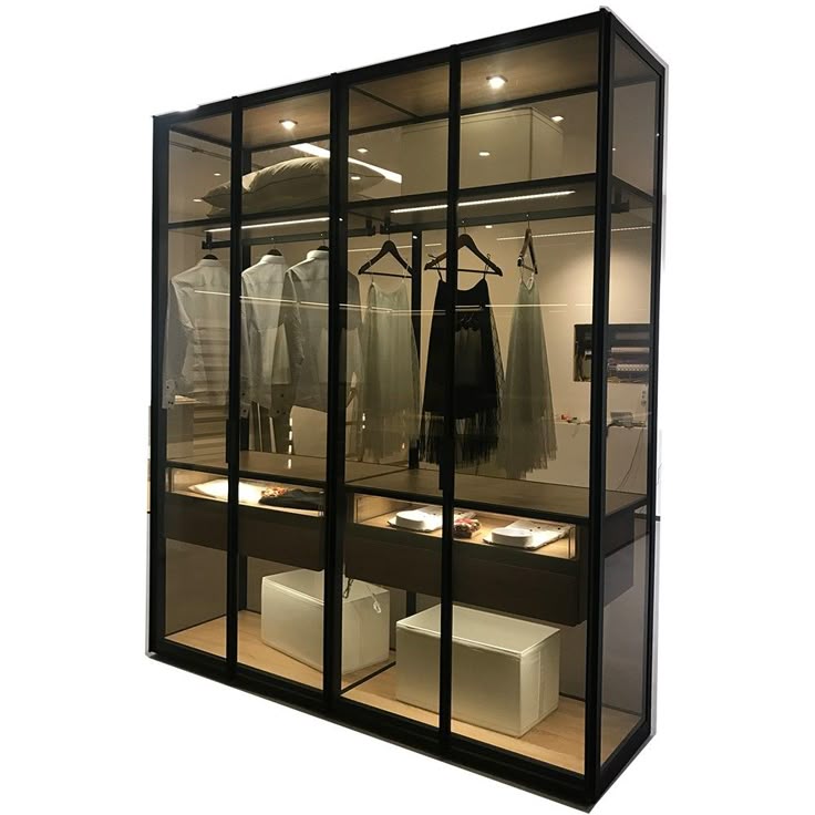 Гардеробная комната отличается от привычного шкафа, поэтому стеклянная дверь в гардеробную тщательно разрабатывается и подбирается при участии дизайнера интерьера.