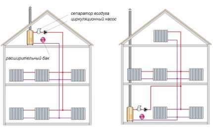 Формирование воздушных пробок – проблема, свойственная системам с принудительной циркуляцией. Для стравливания воздуха их оборудуют либо автоматическим воздухоотводчиком на стояке (справа), либо кранами Маевского на каждом радиаторе (слева)