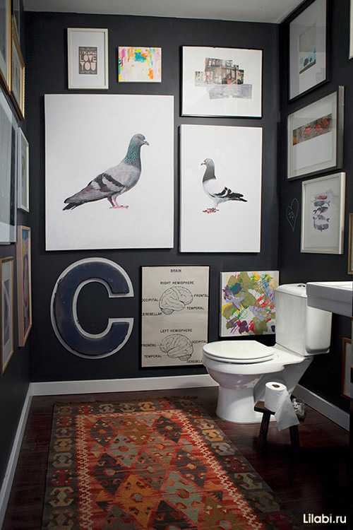 На верхнем фото интерьер туалета с черными стенами. Черный однотонный фон идеальный вариант для целой картинной галереи. Здесь прекрасно вписались картины с изображениями птиц, рыб, абстрактные работы, медицинские таблицы и буква из пластика. Очень стильный вариант, подходящий для креативных молодых владельцев.