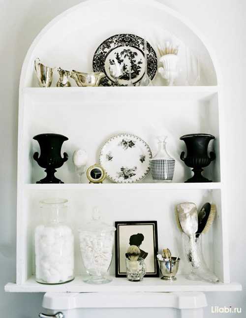 Здесь в нише над унитазом расположились декоративные вазы и тарелки, стаканчики, часы и подставки. Это ещё один из вариантов декорирования ванной разными мелочами.