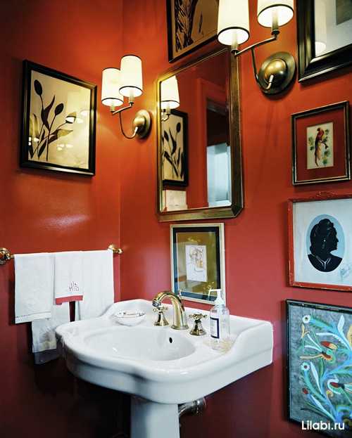 Интерьер ванной комнаты с терракотовыми однотонными стенами украсили картины и зеркало в золотой раме. Они перекликаются с блестящими деталями сантехники, светильников и держателем для полотенца.