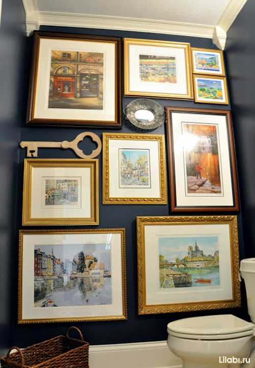 Разбавить галерею картин помогут и другие декоративные элементы. На фото выше пейзажи в багетных рамах, небольшое овальное зеркало и деревянный ключик. Всё выглядит достаточно ярко за счет контрастных темно-синих стен туалета.